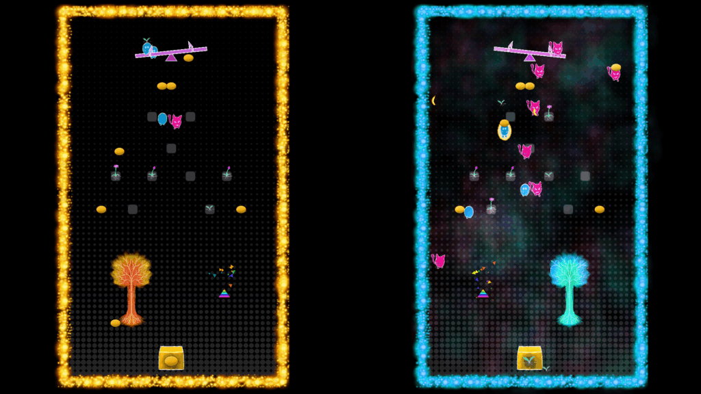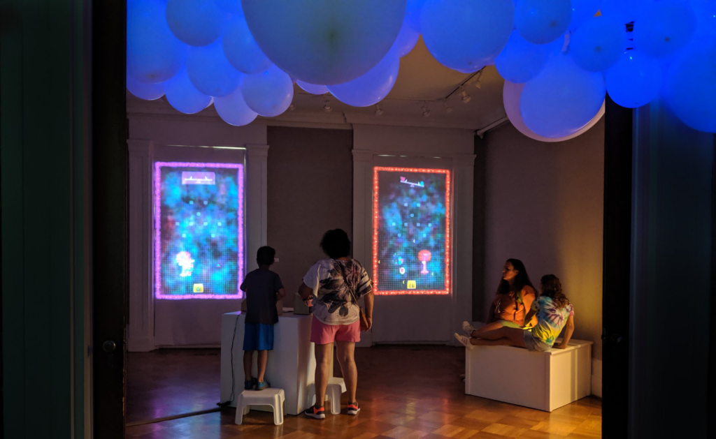 Part of a collection of light based interactive art. I made a simulation of creatures playing in a playground that was projected on a wall and users could use buttons, knobs, and switches to adjust things in the simulation. Balloons lit by LEDs on the ceiling also changed color in coordination with the simulation.